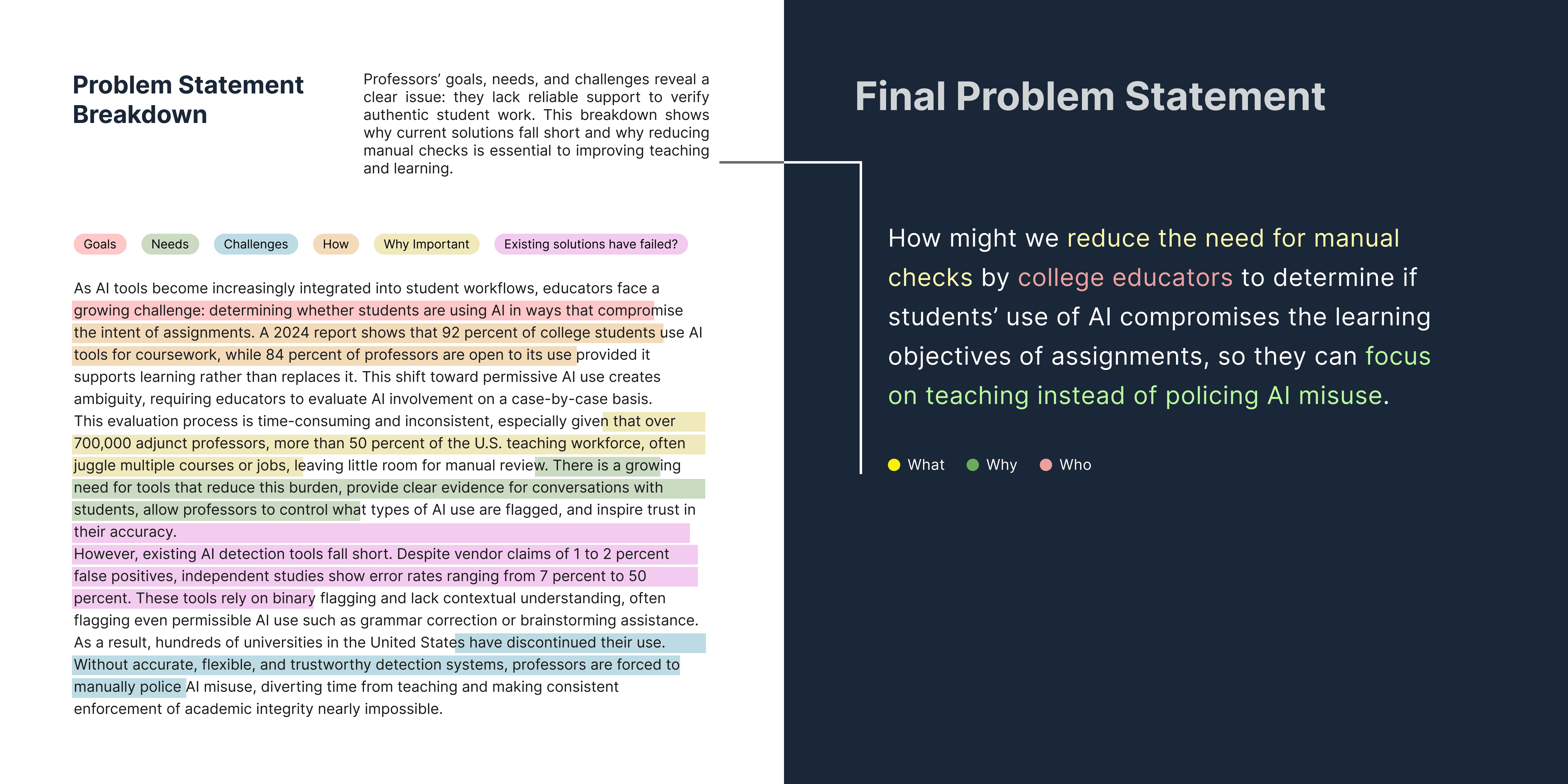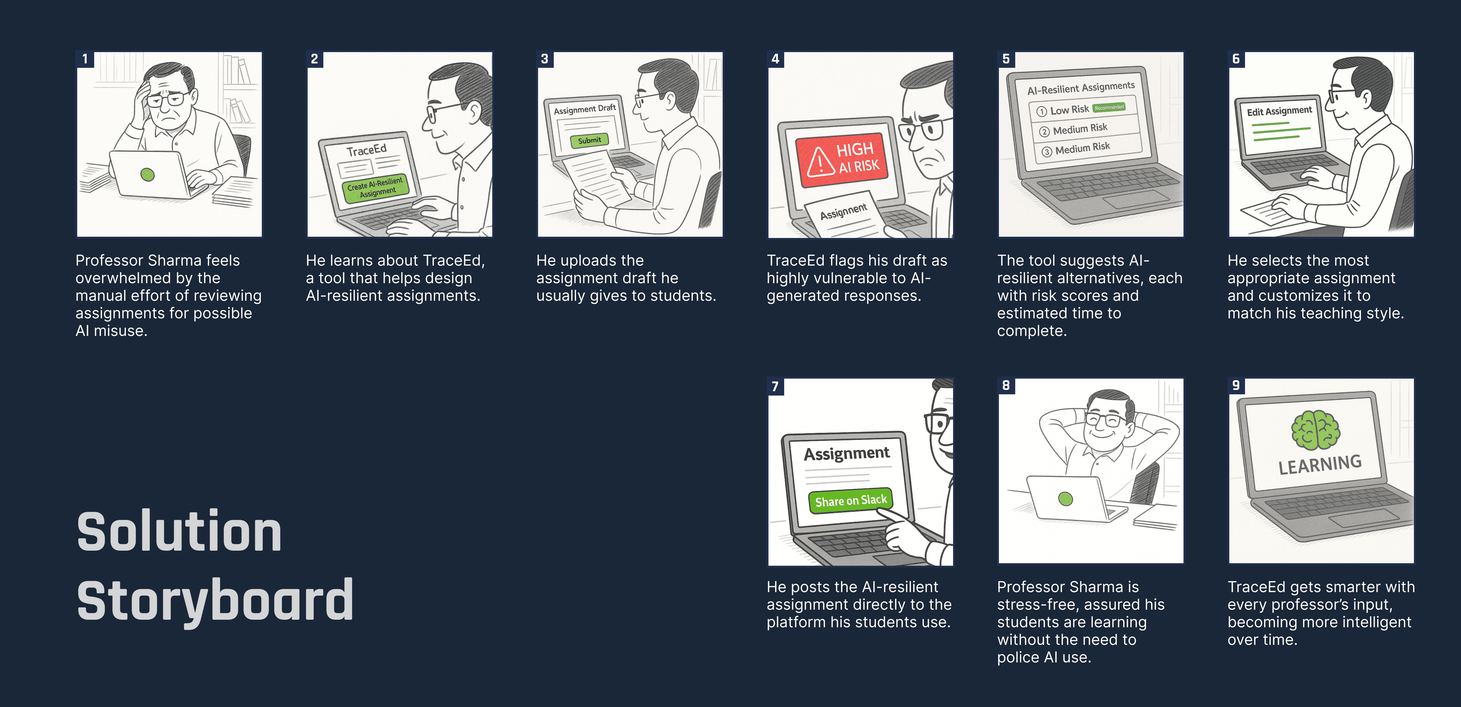 After extensive ideation and storyboarding, the solution converged on a simple but effective intervention: a tool that evaluates assignment drafts and shows professors where and how they can be strengthened against AI misuse.