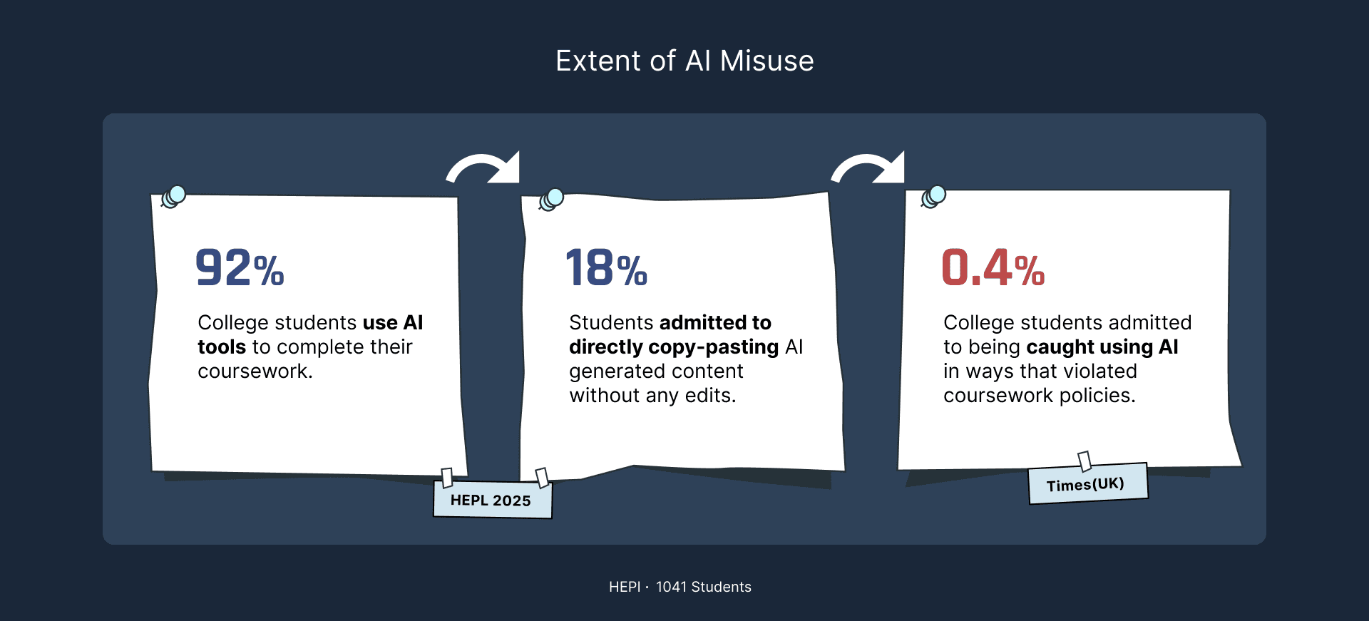 This breakdown has created a massive accountability gap. While 92 percent of students report using AI and 18 percent admit to copy-pasting AI content without edits, only 0.4 percent are ever caught. When misuse goes largely undetected, students lose opportunities to build critical thinking and writing skills, putting the long-term value of their education at risk.