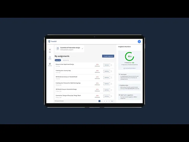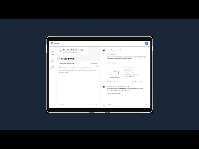 Professors can upload or paste existing assignment drafts into TraceEd. The platform evaluates the assignment’s vulnerability to AI use and generates an AI-resilience score, clearly highlighting weak points. TraceEd then suggests alternative prompts or modifications that preserve the original learning objectives while increasing resistance to AI shortcuts. Even if students use AI, the redesigned assignments ensure that learning goals are still met.