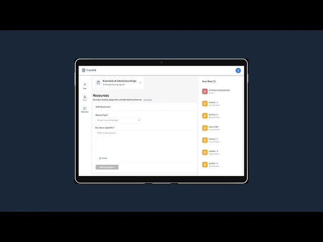 TraceEd also maintains a centralized resource repository. Professors can upload course materials, departmental guidelines, or institutional AI policies, which the system uses to generate more context-aware assignments. Updates to policies or materials automatically influence future recommendations.